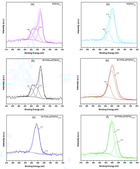 N1s XPS spectra of PDPAC (a,d), IR-PAN-a/PDPAC (b,e), and IR-PAN-a/PDPACIR (c,f) prepared in an acidic (a–c) and an alkaline medium (d–f).