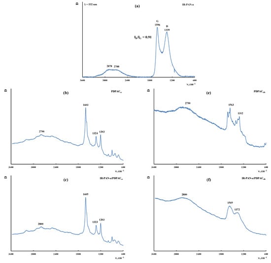 Figure 9 shows the Raman spectra of the IR-PAN-a, PDPAC, and IR-PAN-a/PDPAC composites prepared using two methods before and after IR heating. As can be seen, in the Raman spectrum of IR-PAN-a, there are two pronounced bands: a G band at ~1596 cm−1 from sp2 carbon atoms and a D band at ~1339 cm−1 from sp3 carbon atoms. The G band is a distinctive feature of graphite structures, whereas the D band is associated with disordered and defective structures [43,45]. The intensity ratio of these bands in the IR-PAN-a Raman spectrum is ID/IG = 0.91. The splitting of the G and D bands in the Raman spectra of the IR-PAN-a/PDPAC composites is associated with the presence of a polymer component. The intensity ratio of the ID/IG in the IR-heated composites decreases from 0.76 to 0.73 (IR-PAN-a/PDPACac-IR) and from 0.87 to 0.82 (IR-PAN-a/PDPACalk-IR), which is associated with the dehydrogenation of phenylenamine structures of the polymer component with the formation of sp2 carbon atoms.