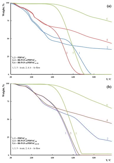 TGA thermograms of PDPAC (1, 2), IR-PAN-a/PDPAC (3, 4), and IR-PAN-a/PDPACIR (5, 6) prepared in an acidic (a) and an alkaline medium (b) at heating of up to 1000 °C in the Ar flow (1, 3, 5) and in the air (2, 4, 6).