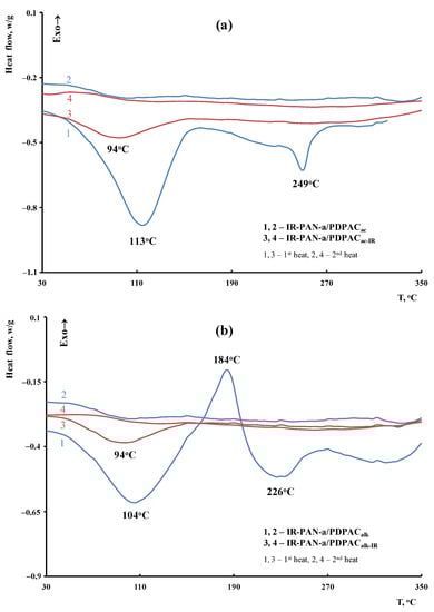DSC thermograms of IR-PAN-a/PDPAC (1, 2) and IR-PAN-a/PDPACIR (3, 4) prepared in an acidic (a) and an alkaline medium (b), upon heating in the nitrogen flow to 350 °C (1, 3—first heating, 2, 4—second heating).