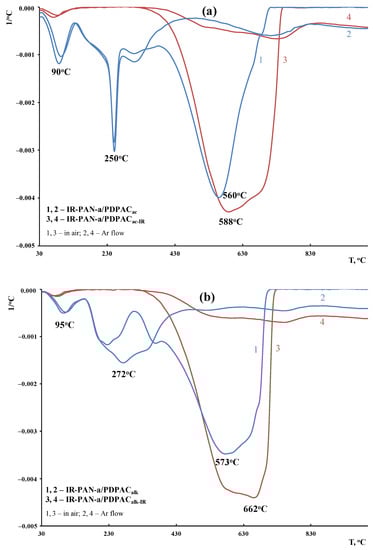 DTG curves of IR-PAN-a/PDPAC (1, 2) and IR-PAN-a/PDPACIR (3, 4) prepared in an acidic (a) and an alkaline medium (b), in the Ar flow (1, 3) and in the air (2, 4).