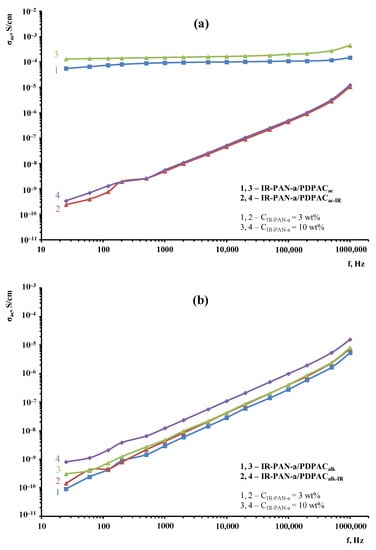 As seen, regardless of the method of synthesis, the electrical conductivity of the IR-PAN-a-based composites has little dependence on the carbon material concentration at CIR-PAN-a = 3 and 10 wt %. The value of n = 0.30–0.999 calculated using the equation of the frequency dependence on the electrical conductivity indicates the hopping conductivity mechanism (0 ≤ n ≤ 1) [46,47].