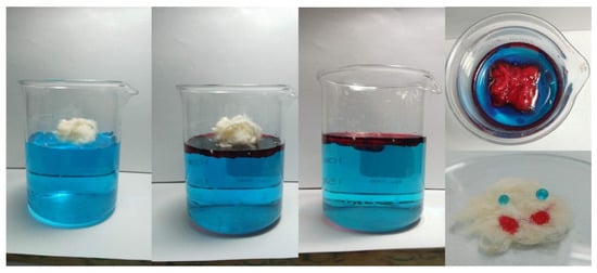The coating also rendered the fibers more hydrophobic with a static water contact angle of 137.4°, as seen from Figure 1d. This value improves 129° for raw-KF obtained from a previous study []. The hydrophobicity of CaSt2-KF is proven further by a simple surface wettability test as seen in Figure 2, which shows the high selectivity of the fibers to oil as it readily adsorbed onto the surface of the fibers upon contact. The CaSt2-KF also maintained its buoyancy despite being ridden with oil on the water surface, which is essential in oil spill remediation.