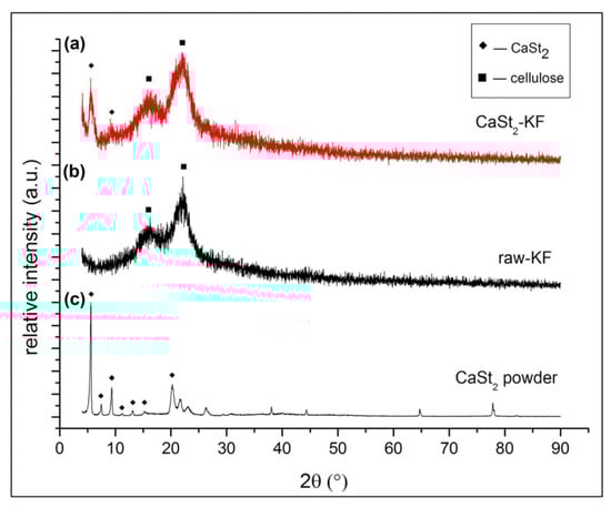 Figure 3 shows the XRD patterns of CaSt2-KF, raw-KF, and CaSt2-KF powders. The diffraction peaks at 2𝜃 = 5.58, 9.10, 15.60, and 22.33° characteristics of CaSt2-KF are seen in Figure 3a. The diffraction peaks at 2𝜃 = 15.60 and 22.33° refer to the crystalline components of cellulose []. These are the only characteristic peaks from raw-KF, as seen in Figure 3b. Cellulose in kapok fibers may be amorphous and crystalline. The amorphous cellulose components in kapok fibers are found primarily on the outer wall of the fibers, while crystalline components are in the inner wall [,]. The presence of CaSt2 on kapok fibers is indicated by the diffraction peaks at 2𝜃 = 5.58 and 9.10°, which were observed from the XRD pattern of synthesized CaSt2 powders from Figure 3c. CaSt2 powders were prepared with the same process of CaSt2-KF sans the kapok fibers. The diffraction peaks at 2𝜃 = 5.63, 7.48, 9.36, 11.18, 13.18, an 15.28° shown in Figure 3c represent the crystalline bilayers of CaSt2 []. The broadening of some peaks in the spectra of CaSt2-KF in Figure 3a may have been influenced by the amorphous components of kapok fibers and the presence of non-uniform coating [].