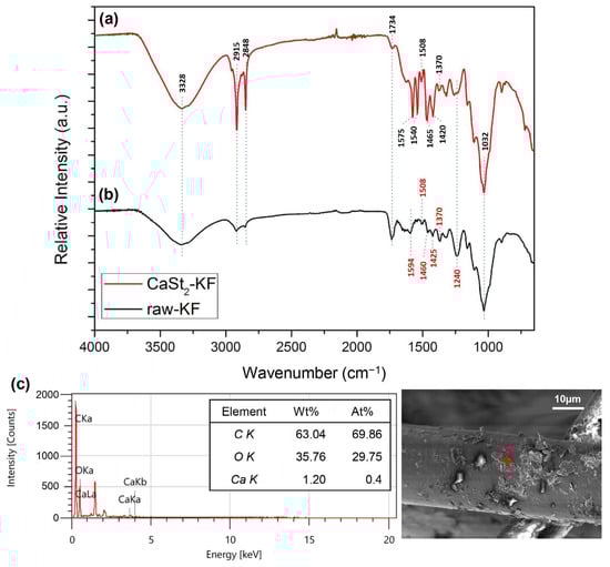 The FTIR spectra of CaSt2-KF and raw-KF can be seen in Figure 4a and Figure 4b, respectively. The presence of the broad –OH– stretching vibration peak at 3328 cm−1 and C–O stretching vibration peak at 1032 cm−1 in both spectra represents the waxy cutin and cellulosic components of the kapok fibers [,,]. The peaks at 2915 cm−1 and 2848 cm−1 belong to the asymmetric and symmetric –CH– stretching vibrations, which may be associated with the cellulose and plant wax [,]. The spectra of CaSt2-KF in Figure 4a showed an increase in intensity for the peaks at 2915 cm−1 and 2848 cm−1, indicating the presence of CaSt2 []. Plant wax is also characterized by the peaks at 1734 cm−1 and 1370 cm−1 corresponding to C=O stretching vibrations and C=O acetyl group stretching at 1240 cm−1. These peaks correspond to the aliphatic aldehydes, esters, and ketones of plant wax [,]. CaSt2-KF showed a decrease in intensity for these peaks, which indicates the possible deesterification of kapok fibers due to the presence of NaOH in the CaSt2 solution []. The skeletal C=C stretching vibrations at 1594 cm−1, 1504 cm−1, and 1460 cm−1 of lignin and –CH– stretching vibrations at 1425 cm−1 are all present in raw-KF. However, only the peak at 1504 cm−1 remained for CaSt2-KF. The other peaks were masked by the addition of new pronounced COO– asymmetric stretching vibration peaks at 1575 cm−1 and 1540 cm−1 and COO– symmetric stretching vibration peaks at 1465 cm−1 and 1420 cm−1 corresponding to CaSt2 [,]. The decrease in the intensity of peaks attributed to plant wax and lignin in the spectra of CaSt2-KF may have exposed the cellulosic structure of the kapok fibers as indicated by the strong and broad –OH group peak. This –OH group has the potential to chemically bond with the CaSt2 coating []. As shown in the schematic in Figure 5, CaSt2 is composed of a Ca2+ ion head and two long alkyl chain tails. An ionic or dipole-dipole interaction between the positive Ca2+ of the coating and negative –OH of the cellulose exposed on the fiber surface may have occurred during the modification of the kapok fibers. The presence of CaSt2 on the kapok fiber surface is further confirmed by the appearance of Ca element through the EDX analysis from Figure 4c. The low amount of Ca may be due to the irregular coating of CaSt2, as seen from the SEM images. Nevertheless, the surface analysis showed that calcium stearate successfully anchored onto the surface of the kapok fibers.