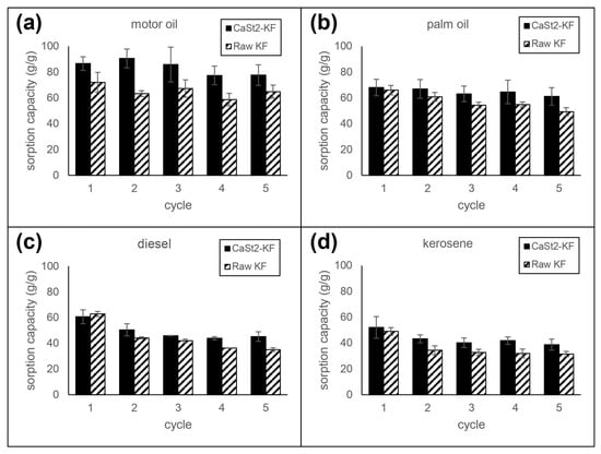 Various oils were utilized to evaluate the sorption performance of the modified kapok fibers. The maximum sorption capacities of CaSt2-KF in different oils are higher than those of raw-KF in Figure 6. CaSt2-KF showed a maximum sorption capacity of 52.07, 60.63, 68.00, and 86.55 g/g in kerosene, diesel, palm oil, and motor oil, respectively. Oil viscosity significantly influenced the sorption performance of the modified and raw kapok fibers. CaSt2-KF exhibited the highest sorption capacity for motor oil, which has the highest viscosity, as listed in Table 1. Low viscosity oils like kerosene and diesel rapidly form a film around the smooth surface of the raw kapok fibers and penetrate the internal lumen. However, low viscous oils can also easily escape or desorb []. High viscosity oils like palm oil and motor oil are more likely to be anchored onto the surface. Penetration is still possible for high viscosity oils, but the rate would be slower []. In this case, the highly viscous oil is entrapped within the fiber assembly through the effect of stronger capillary bridging. The additional surface roughness provided by calcium stearate particles rendered the surface with greater adhesion to highly viscous oils [,,].
