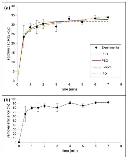The main sorption mechanisms were examined using the pseudo-first-order, pseudo-second order, and Elovich kinetic models. Suitability to the pseudo-first-order model indicates a reversible system wherein physical sorption is the primary sorption mechanism. Linear fitting involves plotting ln(qe − qt) vs. t, where qe (g/g) and qt (g/g) are the sorption capacities at equilibrium and specific time intervals, respectively, t is the immersion time, and k1 is the pseudo-first-order rate constant [,]. Meanwhile, the pseudo-second order model indicates both physical and chemisorption in the system. Linear fitting involves plotting t/qt vs. t, obtaining the pseudo-second-order rate constant k2 [,]. Additionally, the initial sorption rate h can be calculated using Equation (3):
