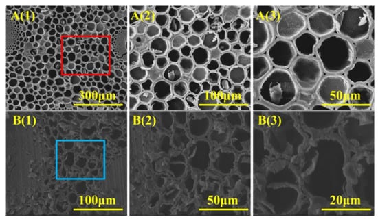 The change in the micromorphology of the bamboo directly affected the macrophysical property of the biomass materials. Thus, the micromorphology of the bamboo specimens after thermal modification were analyzed by SEM, and the related results are presented in Figure 1. Figure 1(A(1)–A(3)) displays the microstructure of the untreated bamboo, exhibiting a natural porous structure with plump and round parenchymal cells. After thermal modification, as shown in Figure 1(B(1)–B(3)), the parenchymal cells were distorted and deformed in comparison to the control. A similar observation was obtained by the previously reported literature [14]. The decomposition of the chemical components in the bamboo cell walls and the evaporation of the moisture in the high-pressure and high-temperature environment led to the thin-walled cells’ deformation during the thermal modification [15]. The detailed changes in the chemical components of the bamboo inner tissue were confirmed by means of the FTIR, XPS, and physical property tests.