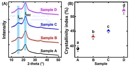 XRD spectra of moso bamboo: (A) related XRD curves of different bamboo specimens; (B) crystallinity index of different bamboo specimens. Different significant differences between different groups (p < 0.05). The error bar in the picture represents the standard deviation.