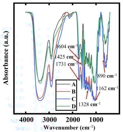 The FTIR curves of different bamboo samples are shown in Figure 3. The region between 4000 and 2000 cm−1 was dominated by the stretching vibrations of the hydrogen-containing groups and the triple-bond and cumulative double-bond regions. The stronger absorption peaks at 3420 and 2917 cm−1 were the stretching vibrations of the -CH and -OH, respectively, which were caused by the action of the high temperature and steam; the hydroxyl groups became active and condensed with each other to remove the water molecules to form ether bonds, thus reducing the number of free hydroxyl groups. But due to the hygroscopic nature of the KBr pressed tablets, the water could not be completely removed, which affected the determination of the peak intensity. The region between 2000 cm−1 and 800 cm−1 provided more information on the chemical composition of the bamboo before and after treatment. The highest peak at 1732 cm−1 was due to the ester linkage of the acetyl and ester or carboxyl groups in the hemicellulose and the coumaric acid in lignin, and this nonconjugated carbonyl peak decreased with the increasing temperature and time due to the degradation of the hemicellulose. The absorption peaks at 1602 and 1507 cm−1 did not change significantly, indicating that the benzene ring skeleton in lignin was relatively stable and did not change significantly. The change in the intensity of the absorption peak at 1376 cm−1 was due to the stretching vibration of the C-H and C-H on the phenolic hydroxyl groups in the hemicellulose and cellulose. The weakening of the absorption peak at 1043 cm−1 indicated a decrease in the number of C-O bonds in the cellulose and hemicellulose.