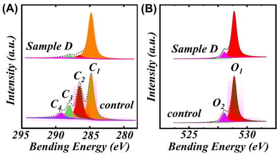 X-ray photoelectron spectroscopy (XPS) is a modern technique for material surface interface characterization, which can qualitatively or quantitatively analyze the specific changes in the carbon and oxygen content, as well as show the changes in the bamboo cell wall, thus fully revealing the thermal modification mechanism. As shown in Figure 4 and Table 2, after thermal modification, the C1 (C-C or C-H) composition increased from 36.5% to 49.6%, while the C2 (C-O), C3 (C=O and O-C-O bonds) presented a decreasing tendency. According to the previous literature [23], the C2 and C3 composition belongs to hemicellulose and cellulose, and the decrease in the C2 and C3 components confirmed the decomposition of hemicellulose and cellulose. The change in O1s, shown in Table 2, also confirmed the change in the wet chemistry method analysis. Therefore, the bamboo surface was low in hemicellulose and cellulose, while it was rich in lignin.