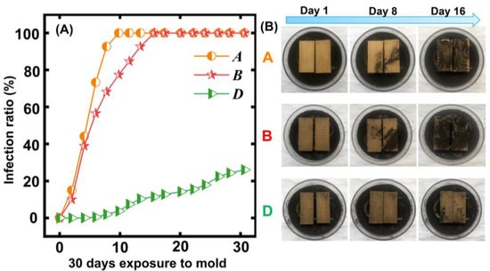 The results of the different bamboo samples exposed to mold for 30 days: (A) the infection ratio of different bamboo samples in one month; (B) corresponded picture during the anti-fungal test.