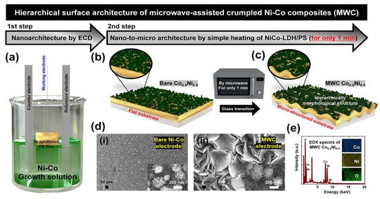 In detail, through a two-step synthetic process of the electrochemical deposition (ECD) and simple heating by microwave for only 1 min, the Ni-Co composited electroactive material was successfully obtained on Ni sputtered PS substrate without any complex procedure. In the first step by ECD (Figure 1a), the Ni-Co composited nanomaterials were deposited onto a conductive PS substrate by dipping in the as-prepared growth solution. When a conductive PS substrate is immersed in a growth solution (Ni-Co compositions), the Ni and Co ions from the solution are absorbed on the surface of the working electrode (Ni-sputtered PS film). In this process, nanoarchitectures are easily achieved via the creation of the Ni-Co layered double hydroxides (LDHs) in unique surface nanomorphology. Further, the NiCo-LDHs/PS electrode resulting from the first step was heated for only 1 min to create a hierarchically designed nano-to-micro surface morphology as shown in Figure 1b,c. Compared to bare electrodes, the hierarchically morphological structure can be easily obtained in the transitioned MWC electrode by the glass transition of PS material.