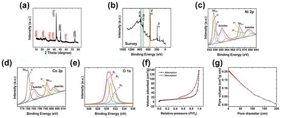Material analysis including (a) X-ray diffractometer (XRD) characterization and (b–e) X-ray photoelectron spectroscopy (XPS) characterization of MWC; (b) survey, (c) Ni 2p, (d) Co 2p, and (e) O 1s spectra. (f) Brunauer–Emmett–Teller (BET) nitrogen adsorption-desorption isotherm and (g) Barrett–Joyner–Halenda (BJH) pore size distribution curve of electroactive materials of NiCo-LDHs.