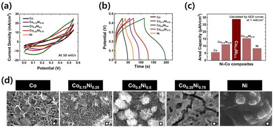 Optimization of ratios of Ni and Co in composites (Ni-Co LDHs). Comparisons of electrochemical performance for various compositions of NiCo-LDHs (Co, Co0.75Ni0.25, Co0.5Ni0.5, Co0.25Ni0.75, and Ni) through (a) CV (at 50 mV/s), (b) GCD (at 1 mA/cm2), and (c) the calculated areal capacity values from the obtained GCD results. (d) Comparisons of surface morphology of all compositions by FE-SEM characterization (all scale bars demonstrated in the SEM images indicate 200 nm.).
