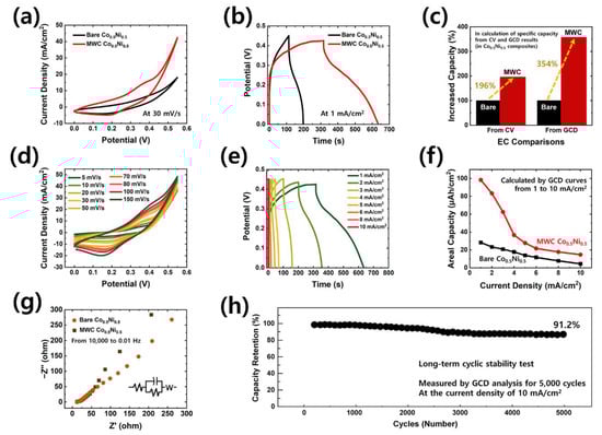 Electrochemical performance of optimized composition of Co0.5Ni0.5. Comparisons of electrochemical performance between bare and MWC through (a) CV (at 30 mV/s), (b) GCD (at 1 mA/cm2), and (c) the calculated values of increased capacity as found in CV and GCD results. Further electrochemical properties of MWC electrode with (d) CV (from 5 to 150 mV/s) and (e) GCD (from 1 to 10 mA/cm2). Comparisons of (f) areal capacity values and (g) EIS Nyquist plots (from 10,000 to 0.01 Hz) between bare and MWC. (h) Long-term cyclic stability test for 5000 GCD cycles (with capacity retention of 91.2%).