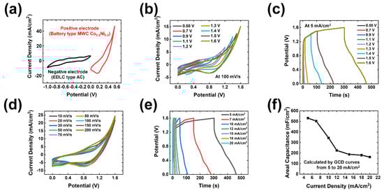 Electrochemical performance of assembled hybrid supercapacitor (HSC). (a) CV graphs of EDLC type AC as negative electrode (from −1.0 to 0 V) and battery type MWC Co0.5Ni0.5 as positive electrode (from 0 to 0.55 V). Electrochemical performance under potential windows from 0–0.55 to 0–1.6 V as indicated in (b) CV curves (at 100 mV/s) and (c) GCD curves (at 5 mA/cm2). Detailed measurement under extended potential window from 0 to 1.6 V in (d) CV graphs (from 10 to 200 mV/s) and (e) GCD graphs (from 5 to 20 mA/ cm2). (f) Areal capacitance values calculated by GCD.
