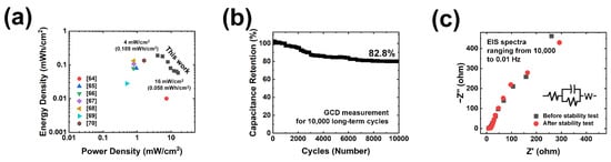 Further, the power density and energy density of the suggested MWC//AC HSC are essential for real-time applications. The Ragone plot in Figure 6a shows calculated power density and energy density, illustrating the E–P relationship. From these results, a power density of 16 mW/cm2 at an energy density of 0.058 mWh/cm2 and a power density of 4 mW/cm2 at an energy density of 0.189 mWh/cm2 was obtained. The device delivers maximum energy density and power density values that are better than the many previously reported devices as shown in Table S2 (Supplementary Materials) [64,65,66,67,68,69,70]. Finally, cycling stability was considered a crucial parameter for evaluating the performance of HSC devices. As can be seen in Figure 6b, an ultra-high capacitance retention value of 82.8% was achieved even after the long-term GCD cycling test (10,000 GCD cycles). Surprisingly, there is no dramatic change in shape of the EIS curve after the stability test, as shown in Figure 6c. The Rs values were 7.63 and 7.37 Ω, equivalent to the device before and after the cyclic stability test, respectively, while the Rct values were 0.67 and 0.14 Ω, equivalent to the device before and after the cyclic stability test, respectively. With the minor variations in Rs and Rct, the device revealed good conductivity even after 10,000 continuous charging and discharging cycles. Ultimately, all these studies reveal the superior electrochemical properties of the fabricated devices over a long period of continuous utilization in power electronic devices.