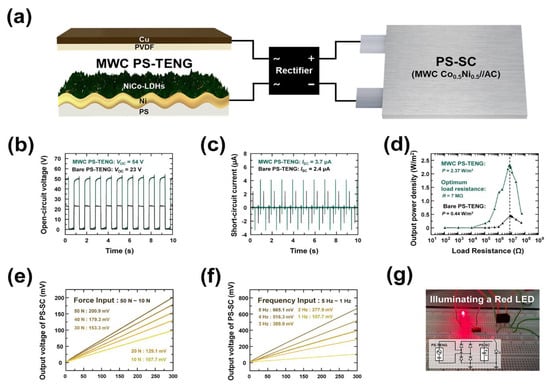 Triboelectric-driven self-charging HSC power cells composed of as-fabricated MWC PS-TENG and PS-SC. (a) Schematic circuit diagram of integrated energy system. Electrical output performance for comparison of bare PS-TENG and MWC PS-TENG; (b) open-circuit voltage (Voc), (c) short-circuit current (Isc), and (d) output power density for the dependence of the load resistance. The charging efficiency under (e) various input forces (from 10 to 50 N), and (f) input frequencies (from 1 to 5 Hz) of MWC PS-TENG. (g) Demonstration of feasible application by lighting up a commercial LED (in inset image of circuit diagram).