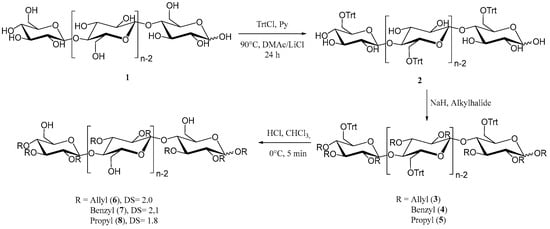 6-O-Trityl cellulose (1 eq) was dissolved in dimethylformamide (DMF), and sodium hydride (6 eq) was slowly added. The mixture was heated to 50 °C using an oil bath on a stirring plate, and the alkyl halide (6 eq) was added dropwise. The mixture was then mixed using magnetic stirring for 16 h at 50 °C. The products were precipitated in isopropyl alcohol, washed, and dried using a rotary evaporator.