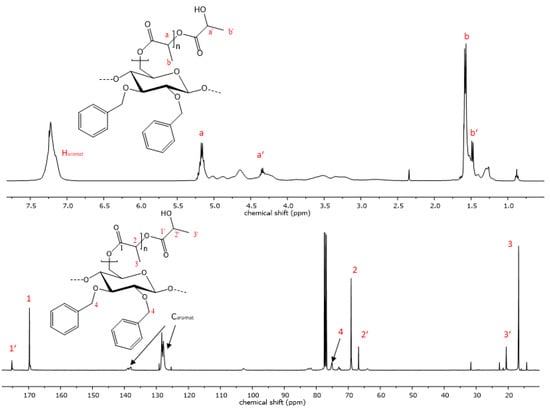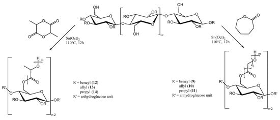 Therefore, for our research, we prepared regioselectively modified cellulose derivatives bearing functional groups, such as benzyl-, allyl-, and propyl moieties at OH-2 and OH-3 of the AGU, to demonstrate the versatility of the cellulose biopolymer in regards to the functionalities that may be introduced into polysaccharide-based copolymers through targeted modification and regioselective reactions, as in our study. After introduction of functionality, the physical properties of these cellulose-based macroinitiators can be further enhanced through the homogeneous ring opening polymerization of L-lactide or ε-caprolactone via the unprotected hydroxyl group at C6 in a “grafting from” approach to prepare the respective copolymers that exhibit a precise and controllable structural composition.