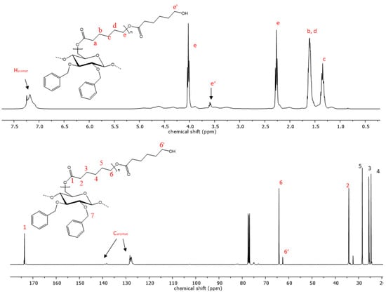 Advances by other authors towards the preparation of polysaccharide-based graft copolymers without a special focus on regioselectivity include the works of Tian et al., and Wohlhauser et al., who grafted PCL onto cellulose nanocrystals using a “grafting from” approach, and verified their successful reaction via infrared spectroscopy [26,27]. Further research in that regard was undertaken using direct grafting of PCL to cellulose pulp in ionic liquids [28]. Using cellulose derivatives for grafting reactions, commercial ethyl cellulose with a DS of 2.3 was utilized in the preparation of cellulose–PCL–PLA grafts copolymers. The authors used commercially available ethyl cellulose, performing the polymerization of PCL in xylene, while the consecutive polymerization of the lactide monomer using the hydroxyl terminated PCL side chains as initiators was performed in bulk. They also reported on the degradation of these compounds and observed a faster degradation when compared to linear PCL [29,30]. Most recently, there has been an effort by Benahmed et al. in their preparation of cellulose acetate-based poly(caprolactone) copolymers [31]. In their research, they pursued a “grafting to” approach using methacrylate modified polycaprolactone and a diisocyanate linker for covalent coupling to the polysaccharide chain similar to previous reports for the modification of cellulose using aliphatic polyesters [32]. Starch-based copolymers with PCL sidechains have also been reported, which were synthesized via ring opening polymerization of ε-caprolactone using ionic liquid catalysts. This was carried out to improve applicability of starch-based materials, and enhance material properties due to the decreased water uptake through combination with hydrophobic PCL [33,34]. Amphiphilic polycaprolactone graft copolymers can also be prepared using chitin derivatives, as in the synthesis of polycaprolactone graft chitosan by Yu et al. [35]. These syntheses also imply a certain degree of regioselectivity as the hydroxyl groups at position 6 were protected by trityl groups and coupling of polyesters was achieved via the amine group of the glucosamine repeating unit and a carbonyl diimidazole activated polycaprolactone.