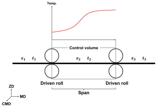 Shin et al. developed a mathematical model that explains the web tension behavior in the open loop section based on the law of conservation of mass, which states that the mass of a material transported within a controlled volume is constant [40]. As shown in Figure 1, Lee et al. further developed the mathematical model proposed by Shin et al. to explain the tension behavior reflecting the thermal effects of a web under high temperatures through a computer simulation and experimental studies [41]. Lee et al. expressed the thermal strain resulting from temperature changes, which was not considered in previous studies, and mitigated the limitations of previous studies by introducing the strain rate while considering the elastic modulus and coefficient of thermal expansion of the web, which vary under high-temperature conditions. The equivalent web strain within the span expressed by Lee et al. (Equation (2)) can be expressed as follows:
