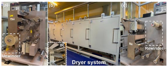 Roll-to-roll manufacturing system: (a) unwinding section; (b) dryer system with air and infrared (IR) heating system; (c) rewinding section.