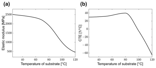 Mechanical and thermal properties of PET film by substrate temperature: (a) Elastic modulus; (b) coefficient of thermal expansion (CTE).