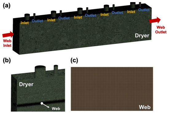 CFD mesh model: (a) roll-to-roll dryer system; (b) dryer cross-section; (c) solid model of the moving web.