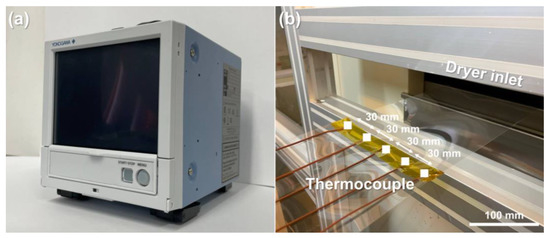 The maximum operating speed was set to ensure that there was time to sufficiently heat the material, considering the total length of the dryer and drying conditions. The minimum operating speed was selected as the minimum value within a range where the tension could be properly controlled while considering the specifications of the roll-to-roll manufacturing system used in the experiment. The maximum operating tension was set based on the recommendation that the operating tension of PET film should be set to a 6.67% yield strength or below [51]. The drying temperature was set so that thermal deformation of the material could be observed within the appropriate temperature range of the PET film. Therefore, by setting the dryer temperature to 100 °C, the MD and CMD temperature distribution of the material and resulting strain distribution were predicted from the operating speed and operating tension. To verify the predicted temperature distribution of the material based on the CFD analysis, the experiment was conducted using the roll-to-roll manufacturing system shown in Figure 2. To measure the material temperature, a data acquisition device (GP10, Yokogawa, Tokyo, Japan), shown in Figure 5a, was used, in which the device was connected to thermocouples to record the temperature. Before the material entered the dryer inlet, five thermocouples were attached to the PET film at constant intervals in the CMD (see Figure 5b) to transport the web.