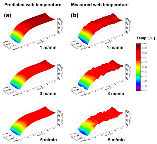 Web temperature in dryer depending on operating speed: (a) predicted web temperature with computational fluid dynamics analysis; (b) measured web temperature through roll-to-roll web transporting experiment.