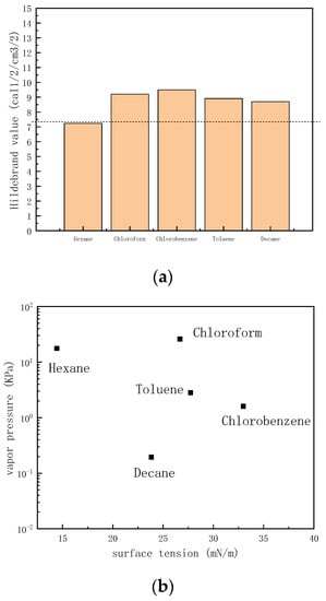 Hexane, chloroform, chlorobenzene, toluene, and decane were selected as the solvent to prepare the PDMS ink. Figure 1a is the swelling relationship of these solvents with PDMS. The dashed line is the Hildebrand value of PDMS at room temperature (δ = 7.3 cal1/2/cm3/2). For a solvent with a Hildebrand value closer to 7.3 cal1/2/cm3/2, the PDMS will have a greater swelling degree. Thus, PDMS exhibited the greatest swelling degree in hexane, but the worst swelling degree in both chlorobenzene and chloroform. Besides the solubility of PDMS, printability also needs to be considered. Considering hexane will easily block the printing nozzle due to its easy volatility at room temperature, toluene and decane were selected as two potential solvents to prepare the polymer ink. Figure 1b is the surface tension vs. vapor pressure of selected solvents at room temperature. Toluene is more volatile than decane at room temperature. This indicates that toluene has a higher potential to block nozzles than decane. Thus, decane was selected as the solvent to dissolve PDMS.