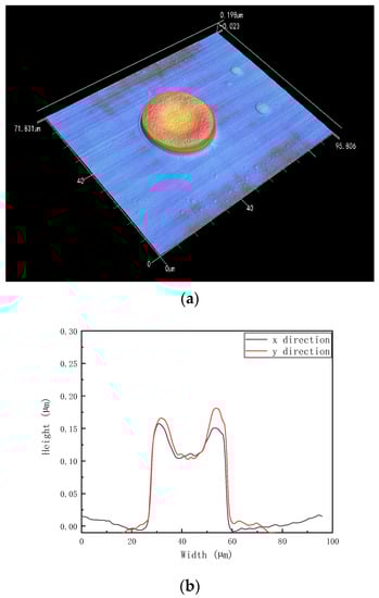 Figure 2a shows the deposit of PDMS ink with decane as the solvent on the sapphire substrate. After drying, a regular PDMS dot is formed, while Figure 2b shows the cross-section of the PDMS dots in the x-direction and y-direction. Figure 2b shows that the width of the dot is 30.8 µm while the height is around 0.12 µm. The polymer dot has less polymer in the center of the dot than at the edge of the polymer dot. The polymer tends to move to the edge of the dots, caused by capillary flow. Once the droplet is deposited on the substrate, the solvent starts to evaporate, while the evaporation flux along the deposit droplet surface is not uniformly distributed [5]. Figure 3 is the schematic image of the drying process.