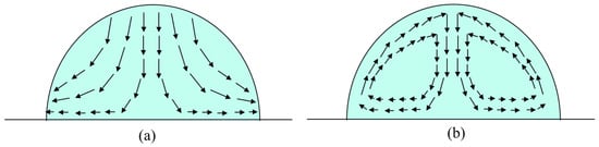Figure 3. The drying process of a PDMS droplet. (a) Fluid flux motion of single-solvent PDMS ink under ambient conditions, (b) Fluid flux motion of PDMS ink combined with a co-solvent under ambient conditions.