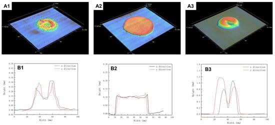 Figure 4. PDMS dots printed on sapphire substrate with different volume ratios. (A1A3) 3D morphology image of PDMS dots, (B1B3) PDMS dots’ cross section profile in the x-direction and y-direction. The volume ratio of decane from (A1A3) is 20%, 50%, and 60%.