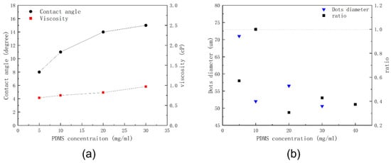 Figure 6. (a) Ink viscosity and ink contact angle with different PDMS concentrations at room temperature (25 °C), (b) PDMS dots’ diameter and ratio of PDMS width to PDMS diameter with different PDMS concentrations.