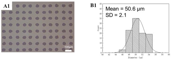 Figure 7. (A1) The microscope image of the printed PDMS dot array on sapphire, (B1) Diameter distribution of the printed PDMS dot array (from arrays of 10 × 10) on sapphire. The standard deviation (SD) was less than 2.53 or approximately 5% of the mean.