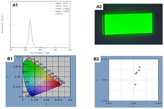 Figure 9. (A1) The photoluminescence (PL) spectrum of the printed green QD-PDMS film at different positions. (A2) Microscope image of the printed green QD-PDMS film under 365 nm UV excitation. (B1) Color coordinate value of the printed green QD-PDMS film. (B2) Enlarged color coordinate value of the printed green QD-PDMS film at different positions.