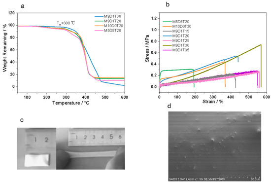 TGA curves (a) and Stress–strain curves (b) of double-network PEs with different ratios of TEOS and zwitterions. (c) Digital images of M9D1T20 before and after stretching. (d) Surface SEM image of M9D1T20.