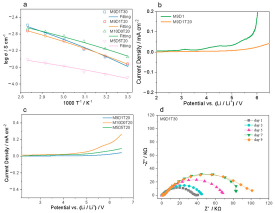 Based on the mechanical property analysis, M9D1T30, M9D1T20, M10D0T20, and M5D5T20 were preferably selected to further test their ionic conductivity between 30 and 80 °C. Overall, the ionic conductivity of the PEs decreases with increasing DPS content, as can be seen from the curves of ionic conductivity and temperature (Figure 3a). For instance, the ionic conductivity of M9D1T30, M9D1T20, and M10D0T20 at 30 °C is 0.30, 0.31, and 0.44 mS cm−1, respectively. Specifically, M5D5T20 with the highest content of DPS shows the lowest conductivity in the whole temperature range (0.14 mS cm−1 at 30 °C). This can most likely be attributed to the fact that polyMPC and lithium ions have a more reasonable coordination interaction, which facilitates the migration of lithium ions. According to the fitted results, M9D1T30, M9D1T20, M10D0T20, and M5D5T20 show activation energies of 8.00, 6.68, 5.65, and 3.57 kJ mol−1, respectively, and all the corresponding curves follow the VTF model [23], which suggests that the polyzwitterion segments have an important role in regulating ion transport. We also compared the ionic conductivity of M9D1T20 and M9D1T30 throughout the temperature interval (Figure 3a) and found that the overall effect of the SiO2 content on the ionic conductivity is not significant. However, we found that the content of SiO2 strongly affects the electrochemical stability of the PE. As shown in Figure 3b, M9D1 without SiO2 has a very unstable electrochemical window (below 3 V). In contrast, M9DT20 exhibits a high electrochemical window of close to 5 V. This is due to the ability of SiO2 to act as Lewis acid and adsorb trace impurities [38], which facilitates the electrochemical stability. Figure 3c shows that the electrochemical windows of the electrolytes after the addition of the SiO2 inorganic networks all exceeded 4 V, and in contrast to the relationship with conductivity, the increase in DPS content is overall favorable for the electrochemical stability. Meanwhile, M9D1T30 also shows a wide electrochemical window of 4.9 V (Figure S2). In conclusion, M9D1T30 is the best sample in terms of mechanical and electrochemical properties. The material has a strain of 569%, a tensile strength of 0.75 MPa, and a high ionic conductivity of 0.30 mS/cm at 30 °C, which is much higher than that reported for other PEs [5,34].