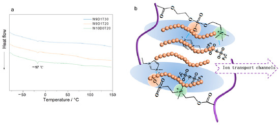 To further understand the ionic transport mechanism of the as-prepared PEs, we further obtained the DSC curves of M9D1T30, M9D1T20, and M10D0T20. Regardless of the sample, there is only one melt peak belonging to the ionic liquid at about 17 °C [39], and no crystalline peak was observed in the sample, indicating that the sample is amorphous, and this amorphous feature facilitates the transport of lithium ions. In addition, there are ion–dipole interactions between the polyzwitterion segments and between the polyzwitterion segments and ionic liquid, which facilitate the formation of dynamic ion transport channels in the electrolyte. In addition, the interface between the inorganic network and the organic network also facilitates the formation of an interfacial transport layer, which promotes the transport of lithium ions. Therefore, we propose the ion transport model for this dual-network electrolyte (Figure 4b).