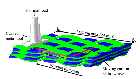 The growing special demand in many fields such as vehicles, military industry and aerospace, has led to the increasing use of carbon fiber reinforced composite parts due to their high specific strength, highlighted interlaminar shear performance, and high damage tolerance [1,2,3,4,5]. The pre-forming stage is the key link in the manufacturing of carbon fiber reinforced composite parts. According to previous studies [6,7,8], pre-forming progress can cause fabric/fabric and fabric/metal tool friction. It should be emphasized that friction may eventually result in the local defects of carbon fabrics [9,10,11,12,13,14]. Therefore, understanding the friction between the tool and fabric surfaces is critical for the forming quality of the composite parts.