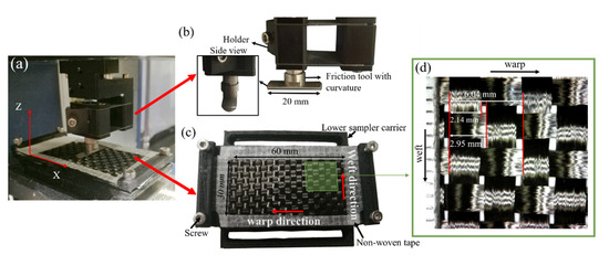 The friction measurements between the carbon fiber plain fabric and the metal tool with curvature were performed using a UMT-TriboLab tribometer (Bruker Nano, Inc, Campbell, CA, USA); with this equipment, the set load can be applied accurately within the effective range (0–20 N). It can obtain the force in the X axis direction and the force in the Z axis direction from the motion process and can calculate the resultant force of the two forces, which is the friction force. Figure 3a shows the photograph of the friction test, which demonstrates that the friction test can be carried out with the help of upper and lower friction devices. The upper friction device in Figure 3b is a semi-cylinder made from ball bearing steels (40 CrMoV), which has a length of 20 mm and a curvature of 0.24. The lower friction device is a self-made fixture, which has the function of fixing the fabric for the friction test. The main body of this device was fabricated by the 3D printer (Raise 3D N2, Inc., Shanghai, China). The four sides of the fabric are affixed by tape to prevent the yarns from detaching from the fabric; then two fastening devices with screws are used to fix the fabric along the warp direction. Figure 3d is a partially enlarged view of the fabric used in the experiment. The carbon plain weave used is made from HF40-12K carbon tows supplied by Hengshen Co., Ltd., Danyang City, Jiangsu Province, China. The weft and warp count is 3.5 yarn/cm and the areal weight is 300 g/m2. It is evident from Figure 3d that the width of the yarn is 2.14 mm and the average spacing between neighboring yarns is approximately 2.95 mm. For the fabric samples, the unit cell length is 6.04 mm.
