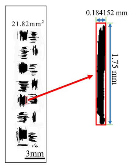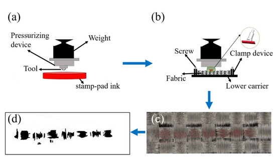 The contact area of the friction pairs is considered as one of the most important factors affecting frictional behavior [28,29,30]. However, the warp and weft yarns in the carbon fiber plain fabric are not closely arranged, and the metal tool with a certain curvature cannot complete contact with the carbon fiber plain fabrics. Therefore, in this study, the contact area between the tool and fabric was tested by a self-developed set-up, as reviewed in Figure 4. The contact area test is conducted in four steps: step-1, installing the metal tool on the self-developed pressurization device, and slowly moving the sliding bracket so that the metal tool is in contact with the stamp-pad ink placed directly below, making sure the stamp-pad ink covers the metal tool evenly (Figure 4a); step-2, installing the metal tool with ink on the pressurization device again, moving the sliding bracket to put it in contact with the fabric directly below, adding the weight to make the stamp-pad ink on the metal tool cover the fabric (Figure 4b); step-3, taking out the fabric in the top layers after 15 s (Figure 4c); step-4, transforming the areas of fabric with rubbings into binary images by adjusting the threshold values and then measuring these areas (Figure 4d).