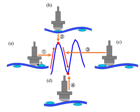 Schematic diagram of the wave-shaped curve generation process: (a) Friction increasing process; (b) Maximum friction; (c) Friction reduction process; (d) Minimum friction.