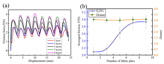The effect of the number of plies on the friction force is shown in Figure 7. As can be seen from Figure 7a, the friction curves maintain a waveform with almost equal spacing between the crests and valleys. This law repeats as the friction displacement increases. It follows from Figure 7b that the frictional force increases with the number of layers of the fabric, particularly between three and seven plies, which produces a rapid increase. The growth of the friction force increases by 20.34% with the increasing number of layers from three to five, while by merely 0.0345% with the increasing number of layers from seven to nine. The distance (D) between the neighboring maximum and minimum values of each cycle remains constant (~3 mm). This means that D is insensitive to the number of plies.