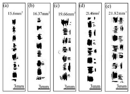 The contact area between the metal tool and the fabrics with different layers can be obtained by using the measurement method of the real contact area in Section 2.2. The morphology of the contact area between the metal tool and the fabric in the range of 1, 3, 5, 7, 9 plies (8 N, 24 mm/s) is illustrated in Figure 8. From Figure 8 it can be observed that the area of the colored part of the fabric increases with the increasing number of layers. This is because the fabric tends to deform, with the same force producing a greater deformation of the multi-layer fabric surface, increasing in the real contact area. This also is also the reason the spacing between the frictional wave maximums and minimums becomes wider with the increase in layers, as it aggravates the impact between the metal tool and the interweaving point.