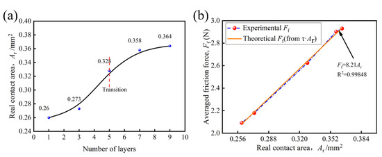 The relationship between the number of plies, the real contact area, and the friction force has been established. The increase in the plies leads to the increase in the real contact area between tools and fabrics. The results of the fit show a linear relationship between the growth of and , on the fabric surface, which is in accordance with the adhesion theory model.