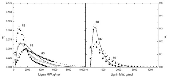Comparisons of MWDs reported by Marathe et al. [6] for (◯) whole lignin and (●) light and (▲) heavy fractions to the MWDs given by Equation (1) that match reported Mw-values for (left) heavy and (right) light lignin triplets, where the numbers for each triplet increase in order for whole lignin, light fraction, and heavy fraction.